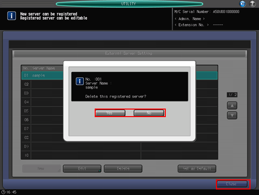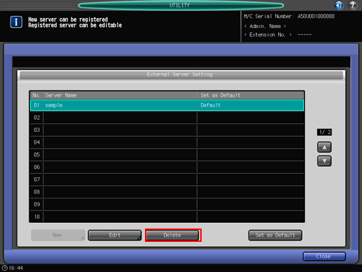 Select a line on the External Server Setting screen and press [Delete] to delete data for the registered external server.