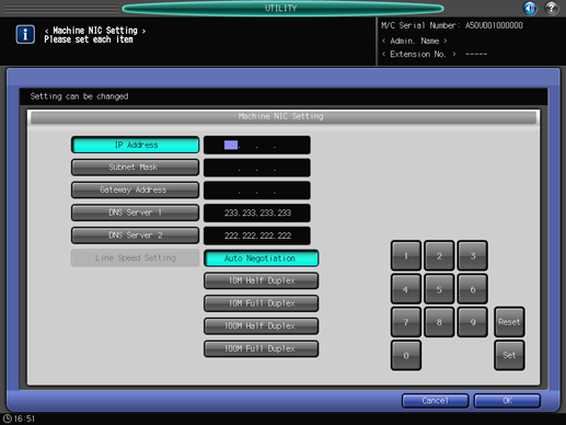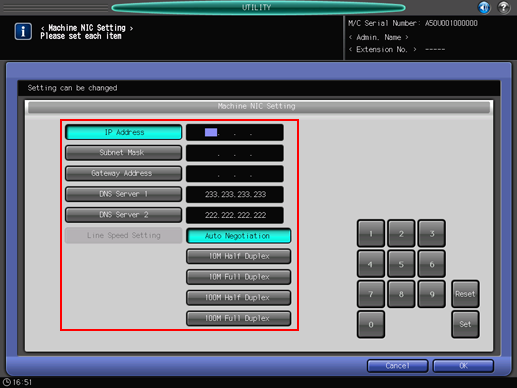 You can set the machine's network-related information, including the IP address. The [NIC Setting] screen depends on the image controller used.
