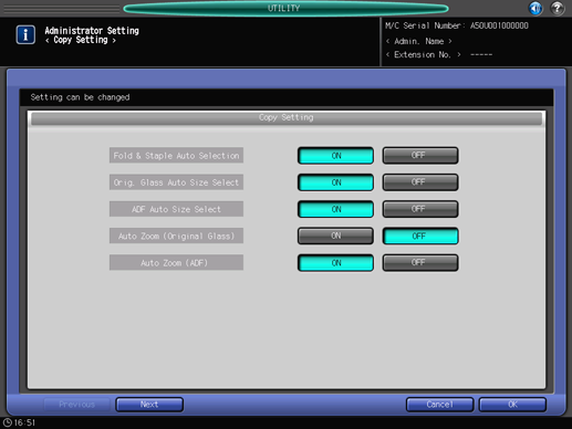 [Auto Zoom (Original Glass)] | Specify whether or not to activate Auto Zoom when an original is placed on the original glass. | ON, OFF |