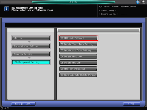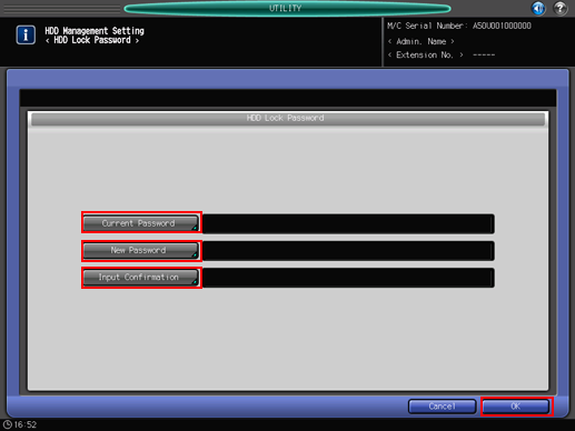 Press [Security Setting] on the [Administrator Setting Menu] screen, and then press [HDD Management Setting] and [HDD Lock Password] in sequence.