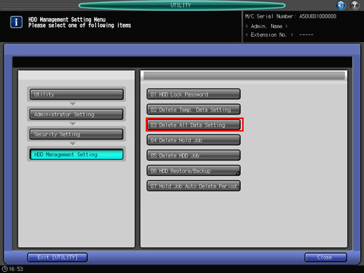 Press [Security Setting] on the [Administrator Setting Menu] screen, and then press [HDD Management Setting] and [Delete All Data Setting] in sequence.