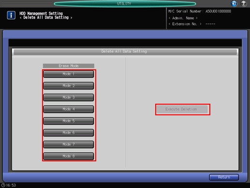 Select the desired erase mode to delete all the data on the HDD or the non-volatile memory of this machine with a specific data. Also execute deleting all the data. Use this function when disposing of the machine.