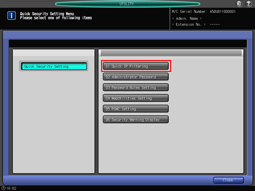 2. Press [Quick IP Filtering] on the [Quick Security Setting Menu] screen.
