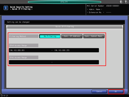 • If you select [Sync. IP Address] or [Sync. Subnet Mask] and press [OK], the IPv4 and IPv6 access ranges will be fixed.