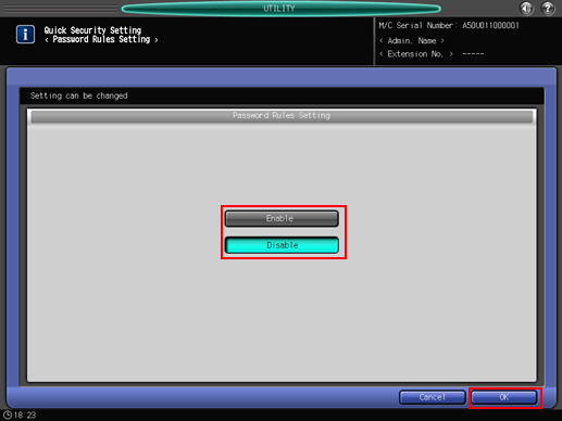 Selecting [Enable] sets the machine to accept passwords specified more strictly than usual, according to the password rules as described below.