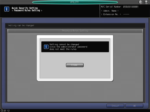 If you press [Enable] with the condition that the default administrator password is kept unchanged or the administrator password does not comply with the rules, a dialog is displayed to reject the selection. Change the administrator password to comply with the rules. For details, refer to Administrator Password: Changing Administrator Password and Turning On the Administrator Authentication Function.