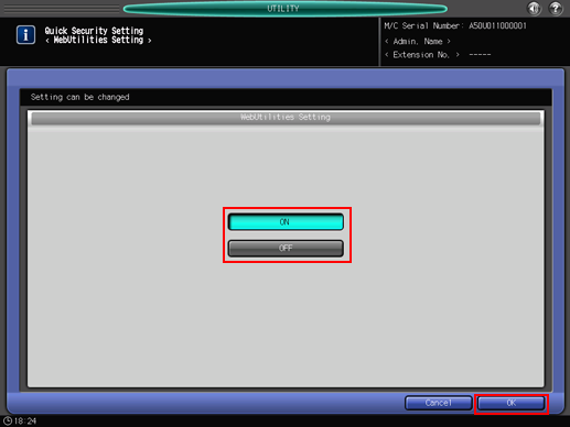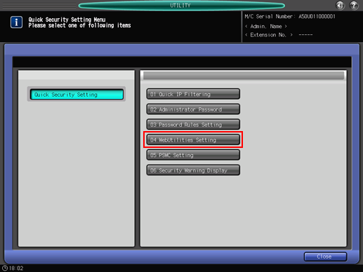 2. Press [WebUtilities Setting] on the [Quick Security Setting Menu] screen.
