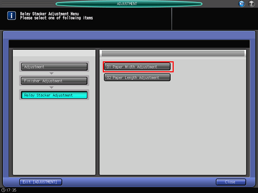 2. Press [Finisher Adjustment], [Relay Stacker Adjustment], and [Paper Width Adjustment] in sequence.