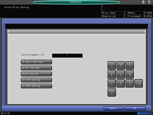 This screen is displayed if you select [Direct Print Setting] in the [Controller Machine Setting Menu] screen. For details about how to display the [Controller Machine Setting Menu] screen, refer to CONTROLLER: Setting the Controller.