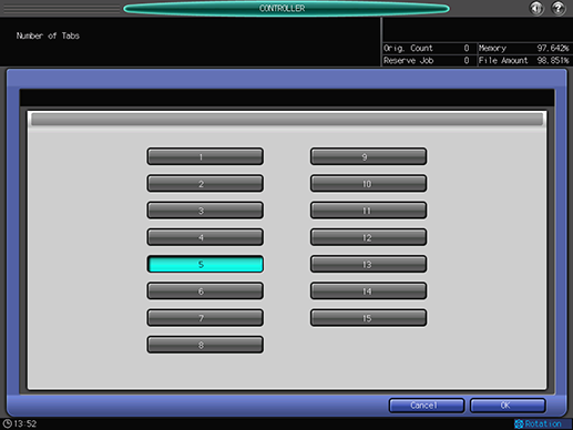 This screen is displayed if you select [Driver Print Setting] - [Number of Tabs] in the [Controller Machine Setting Menu] screen. For details about how to display the [Controller Machine Setting Menu] screen, refer to CONTROLLER: Setting the Controller.