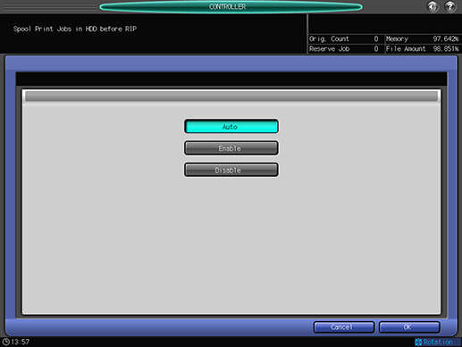 This screen is displayed if you select [Spool Print Jobs in HDD before RIP] in the [Controller Machine Setting Menu] screen. For details about how to display the [Controller Machine Setting Menu] screen, refer to CONTROLLER: Setting the Controller.