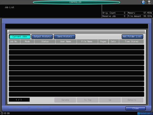 This screen is displayed if you select [Job List] in the [Controller Machine Setting Menu] screen. For details about how to display the [Controller Machine Setting Menu] screen, refer to CONTROLLER: Setting the Controller.
