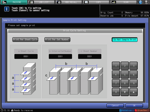 Press [OK] to complete the setting of sample print cycle and return to the [MACHINE] screen.