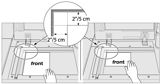 Set the front side of the adjustment chart face up (turned away from the original glass), with its top edge positioned to the back side. Place the top-left corner of the adjustment chart at a distance of about 2 inches (5 cm) each from the vertical size guide and horizontal size guide, and align the left and top edges parallel to the vertical size guide and horizontal size guide on the original glass.
