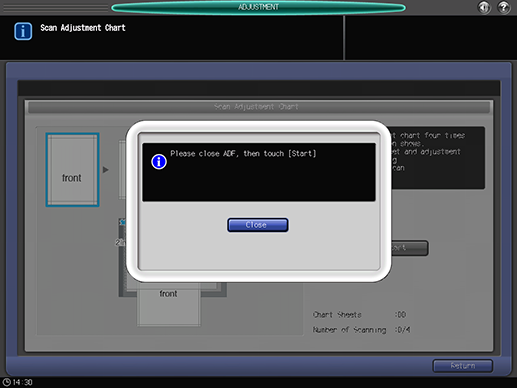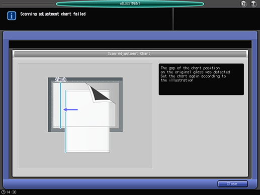 You may see the message [Scanning adjustment chart failed]. Follow the instruction on the screen to correctly set the adjustment chart and background sheet, and then press [Close].