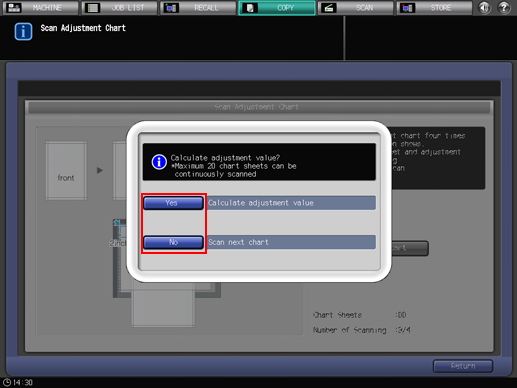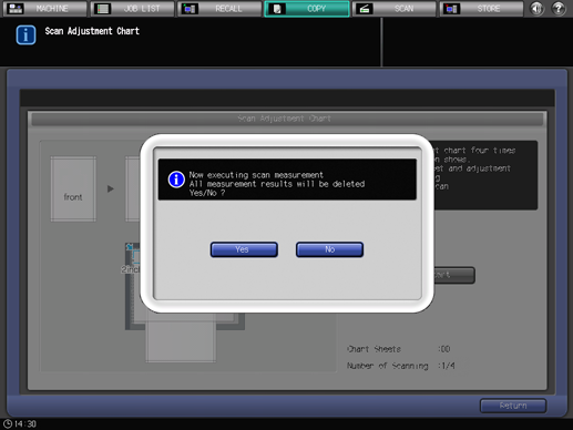 Pressing [No] returns to the [Scan Adjustment Chart] screen on which the counter of [Chart Sheets] is added by one. Repeat steps 6 to 8 for the number of adjustment charts. The measurement results will be added up. This operation can be repeated up to 20 times. When the 20th scan measurement is completed, [No] can no longer be pressed.