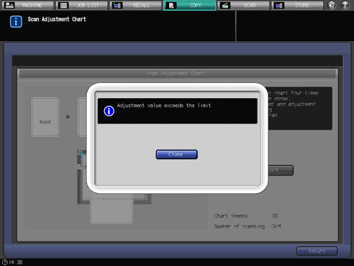 If the adjustment value calculated by pressing [Yes] exceeds the adjustment range, the following dialog is displayed. Press [Close] to discard the measurement results, and restart the scan measurement from the beginning.
