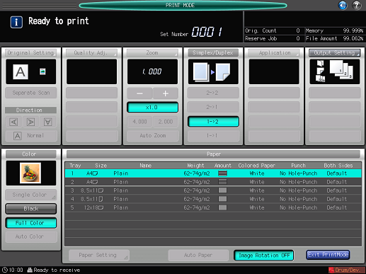 17 or larger to output the background sheet. When you press [Output Background Sheet] to display the [PRINT MODE] screen for the background sheet, the tray selected in step 2 is automatically selected on the screen, but it can be changed as desired. Select a tray loaded with A3 or larger, or 11