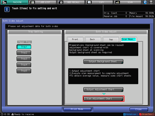 The [Scan Meas.] Adjustment is a simple method to adjust only the magnification ratio and image position of the back side. To adjust both front and back sides, perform the [Chart Adjustment] or [Zoom]/[Image Shift] Adjustment.