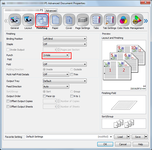 Setting [Punch] on the [Finishing] tab allows you to make punch holes (2 holes, 3 holes, 4 holes, or Swedish 4 holes). Mount Punch Kit PK-522 to Finisher FS-532.