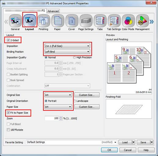 When setting in the printer driver, make sure that there are no previous settings left in each item in the tabs [Layout], [Finishing], [Cover], etc.