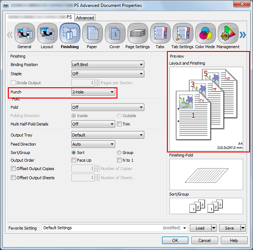 Setting [Punch] allows you to make punch holes (2 holes, 3 holes, 4 holes, or Swedish 4 holes). Mount Punch Kit PK-522 to Finisher FS-532.