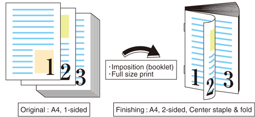 Impose an A4-size PDF document with 32 pages on A3 papers, and then finish with the booklet function.