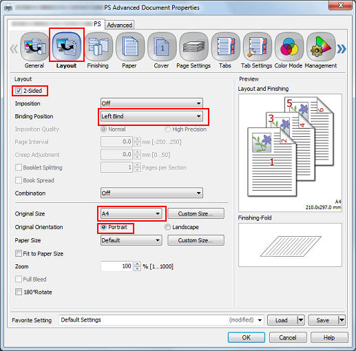 When setting in the printer driver, make sure that there are no previous settings left in each item in the tabs [Layout], [Finishing], [Cover], etc.