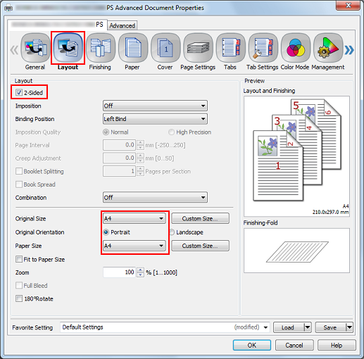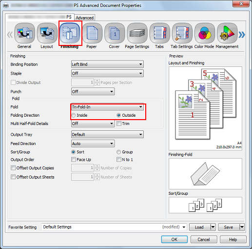 Click the [Finishing] tab, and then set [Fold] and [Folding Direction].