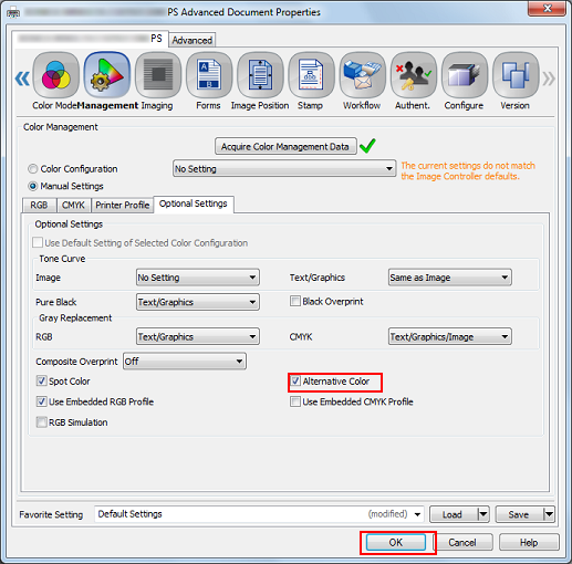 Using Color Centro allows registering and editing alternative colors. (Refer to Image Quality: Registering an Alternative Color (RGB -> CMYK) or Image Quality: Registering an Alternative Color (CMYK -> CMYK).)