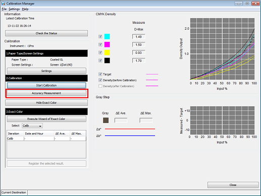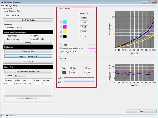 7. Check the measurement results (CMYK density and Gray Step) on the [Calibration Manager] screen.