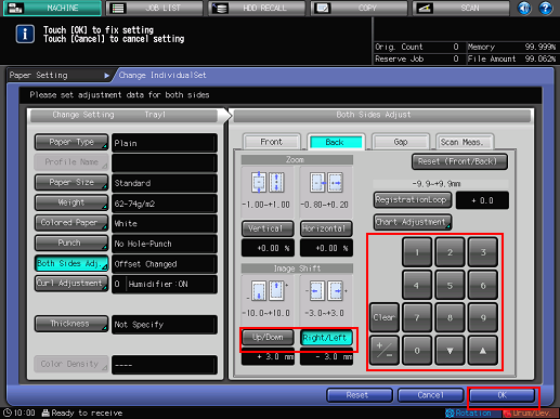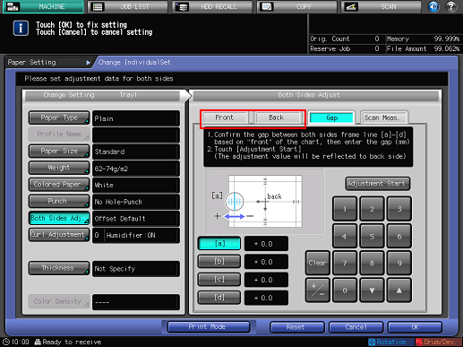 Example: [Back] is selected for Image Shift adjustment. To adjust the front side, press [Front].