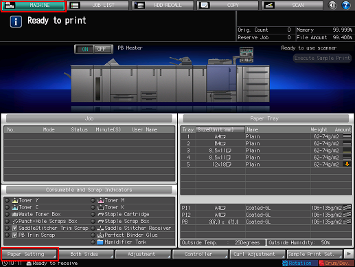 On the touch panel of the main body, press [Paper Setting] on the [MACHINE] screen.