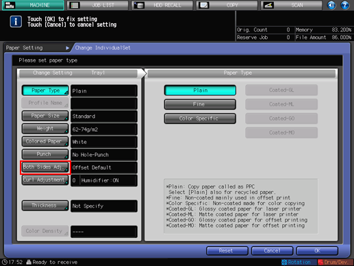 As a general rule, set the Image Shift adjustment setting for each paper type. It is recommended that frequently used paper settings be saved as a paper profile. (Refer to Registering Paper Profile (Paper Catalog).)