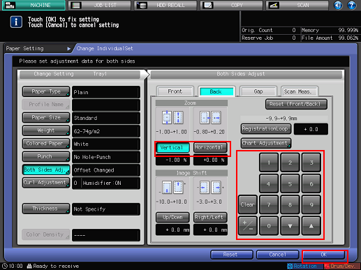 Example: Adjust the horizontal/vertical magnification for the [Back] side. To adjust the horizontal/vertical magnification of the front side, press [Front].