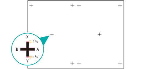 Print the original and measure the misalignment on the front and back sides using a scale magnifier.