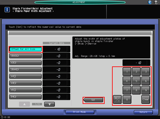 Example: Make the staple paper width for [Offset for All Size] (all paper sizes) narrower by 1 mm.