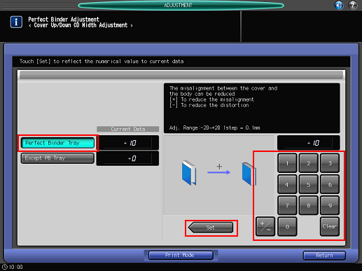 Press [Perfect Binder Tray]. Enter the adjustment value and press [Set].