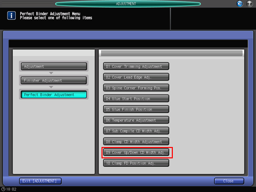 Press [Cover Up/Down CD Width Adj.] on the [Perfect Binder Adjustment] menu.