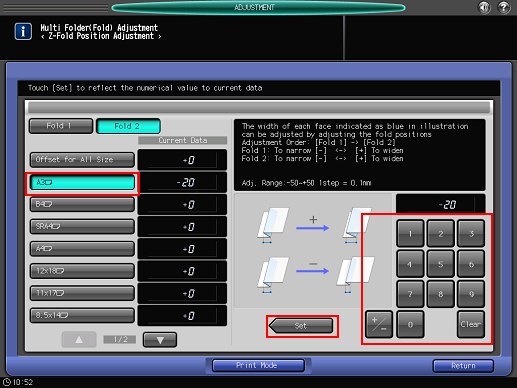 Select the paper size and press [Fold 1] or [Fold 2]. Enter the adjustment value and press [Set].