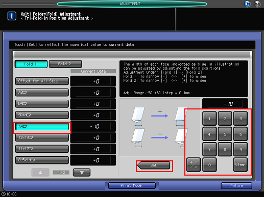 Select the paper size and press [Fold 1] or [Fold 2]. Enter the adjustment value and press [Set].