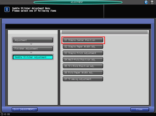 Press [Staple Center Position] on the [Saddle Stitcher Adjustment] menu.