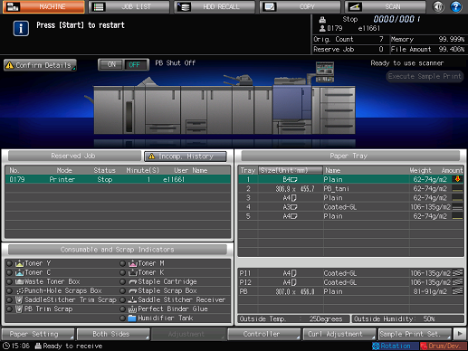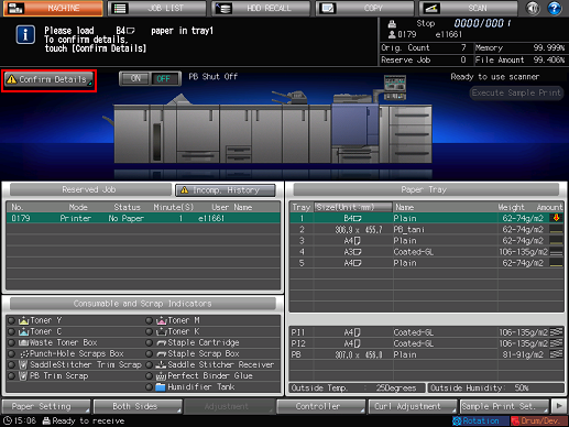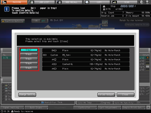 When the tray being used in the print job operated from a PC becomes empty, printing stops and the message [Please load $####### paper in tray$ / To confirm details,touch [Confirm Details]] is displayed on the screen.