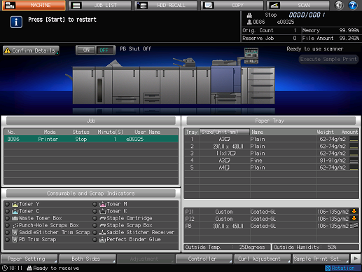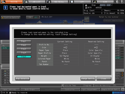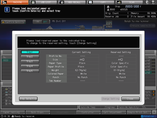 The paper setting of the selected tray (Current Setting) and that required by the print data (Reserved Setting) are displayed.
