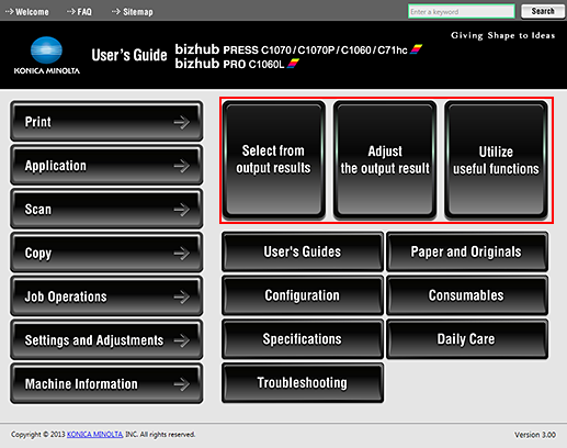 You can search for information based on the purpose, for example, to use functions in combination, to adjust the output, or to streamline workflow.