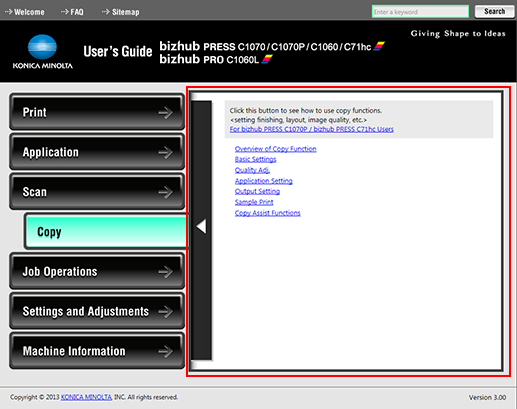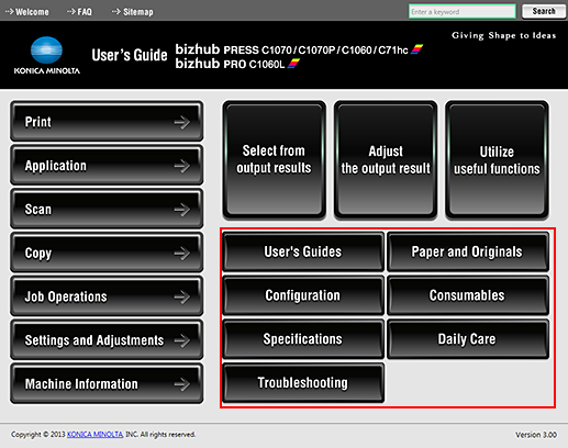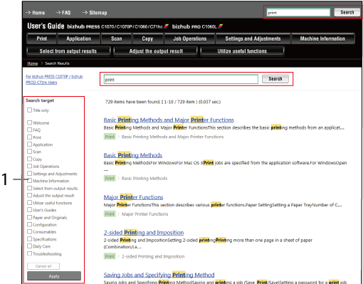 The search field at the top of the manual can be used to search for the necessary information from the User's Guide. Enter any keyword in the search field and click [Search].