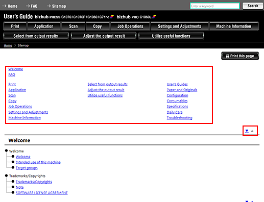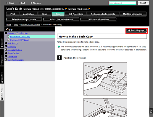 To print the User's Guide, click the [Print this page] key, or [Select Print] key, which is found on the User's Guide window. If the browser's print menu is used to print the User's Guide, it may not print properly.