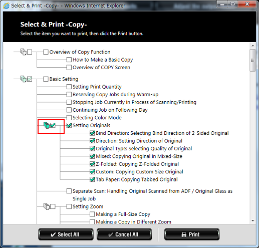 Clicking [Select Print] on the left part of the table of contents displays the pages with checkboxes on the table of contents.