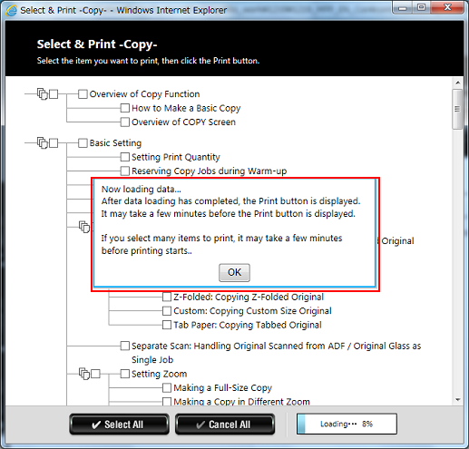 In some cases, it may take time for the [Select Print] page to be displayed. If this occurs, after reviewing the content of the window, click [OK] and wait for the page to load.
