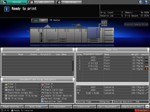 The default display on the touch panel of bizhub PRESS C1070P / bizhub PRESS C71hc is different. [COPY] and [SCAN] are not displayed.